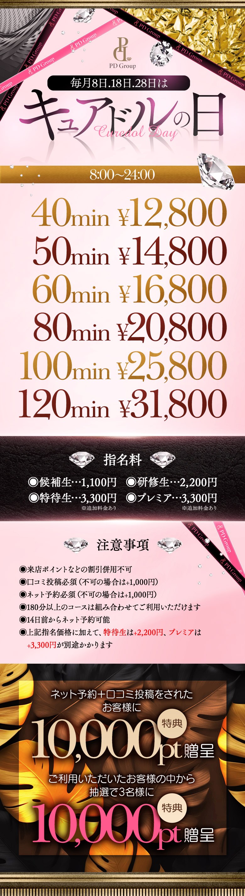 - ★福岡発祥 PD Group 5店舗目 New Open★ 福岡中洲にて 繁忙期12月24日グランドオープン 外装、内装共に改修工事を行なっているので、 新築同様の店舗になります! ☆PD Groupの歴史☆ ■2021年2月 アイドルチェッキーナ Open ■2022年10月 あつまれぴえん学園 Open(現在閉店) ■2022年11月 アイドルアバロン学園 Open ■2023年9月 ラブリリーアイドルプロデュース Open ■2024年2月 アイ学1ST Open ■2024年6月 アイドルチェッキーナ 大箱店へ移動 ■2024年12月 キュアドルナース Open ■2025年4月 新たな新ジャンルコンセプト 近日公開 【PD Groupの自慢すべき点】 ◆自社撮影スタジオ 3箇所 ◆自社カメラマン 1名 ◆自社デザイナー 4名 ◆自社イラストレーター 1名 ◆自社レタッチャー 2名 ◆無料送迎業者 ◆専属清掃業者 ☆充実した福利厚生☆ 【24時間ジム 利用料無料】 【美容医療が30%OFF】 【お家探し 30%OFF】 【友人紹介で5万円プレゼント】